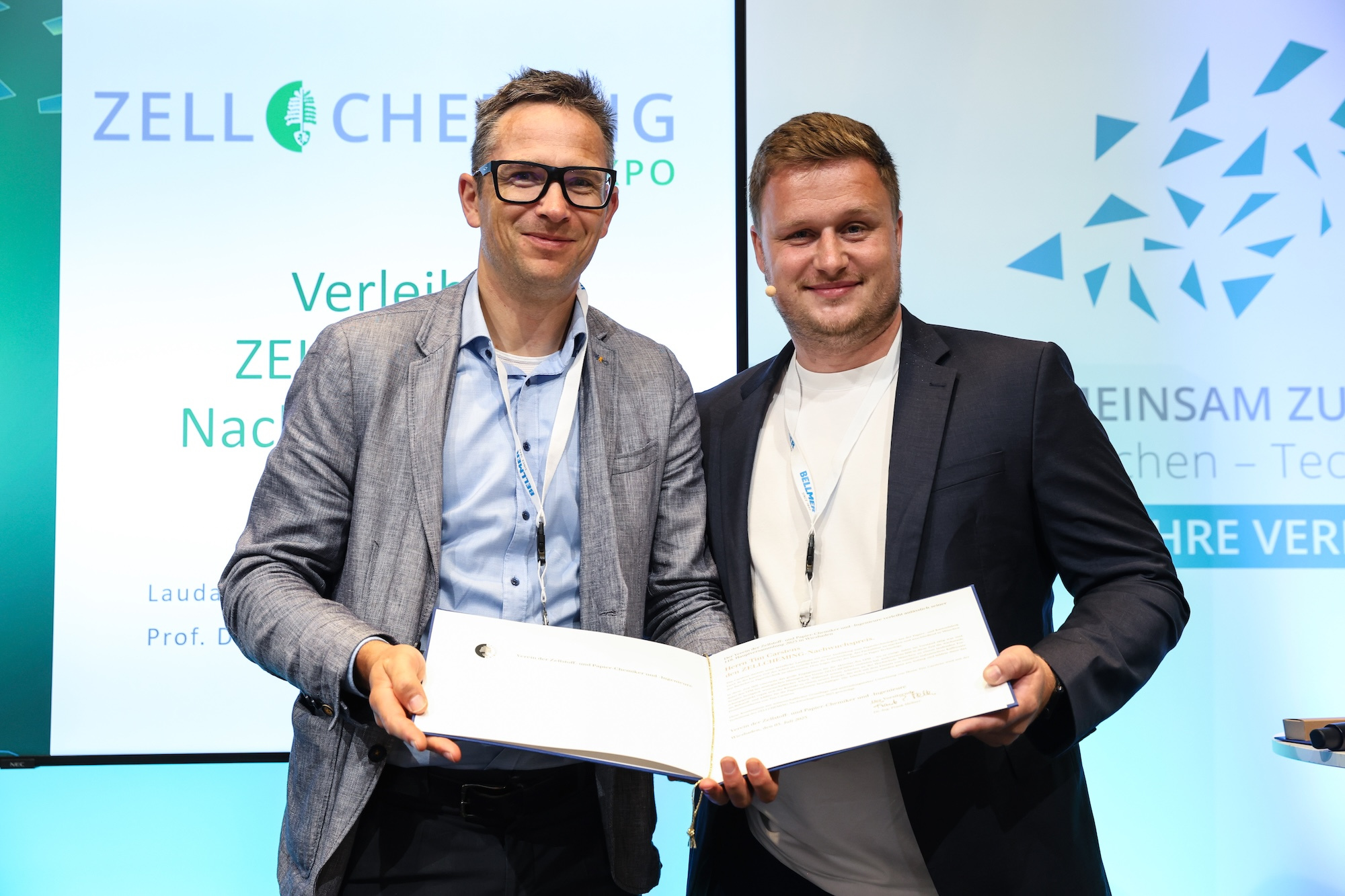 The ZELLCHEMING Young Talents' Award was awarded for the first time on occasion of the 100th Annual General Meeting of the ZELLCHEMING association. It is granted to industry and science employees younger than 35 years (at award) for excellent academic, technological and economic achievements in the fields of pulp and paper production and processing as well as environment protection. The achievements are assessed according to the following criteria: